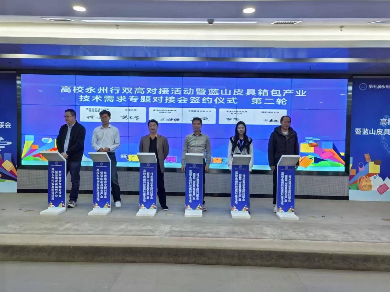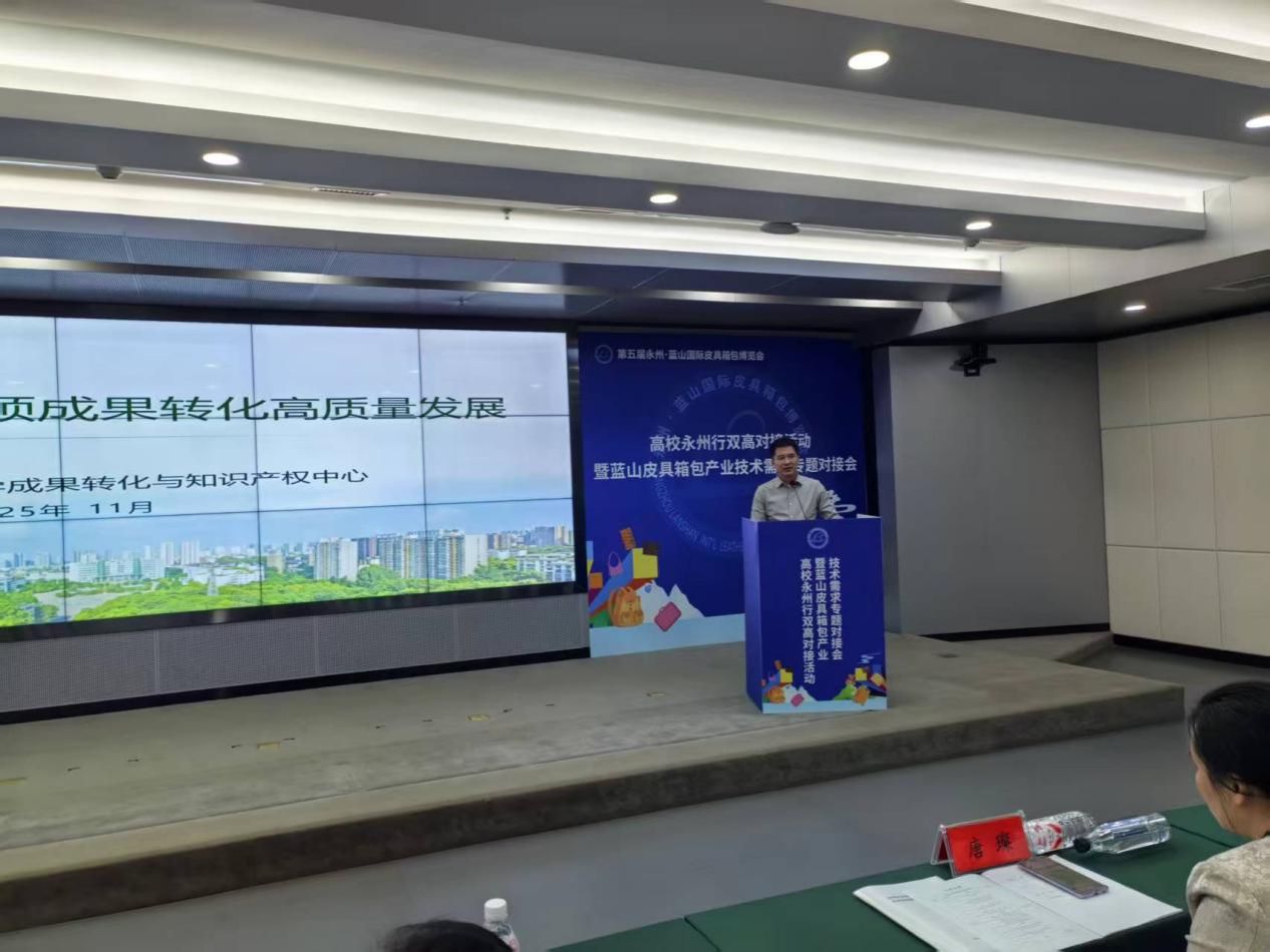 11月14日,“高校永州行双高对接活动暨蓝山皮具箱包产业技术需求专题对接会”在永州蓝山县隆重举行。省科学技术厅二级巡视员李征宇出席并讲话,省内外7所高校专家、百余家企业代表齐聚一堂,我校成果转化中心夏换主任率专家团队深度参与其中。