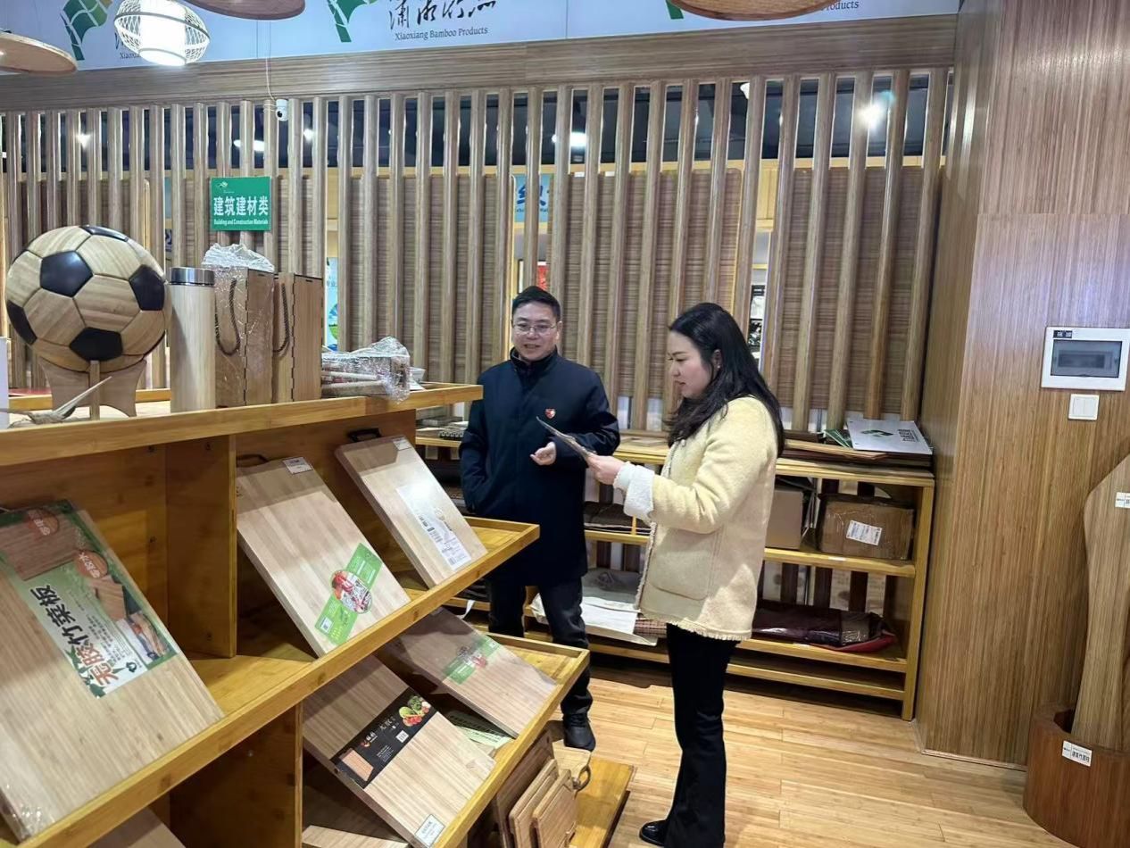12月25日上午,湖南金霞发展集团有限公司副总经理文杰、张笑、杨建、周斯怡一行莅临我校考察交流。在李明老师带领下,考察团一行首先参观了湖南省竹产业协会潇湘竹品展厅,展厅内各类竹制家居用品、竹酒、文创产品、建筑材料等创新成果让嘉宾们眼前一亮,纷纷驻足询问产品工艺与应用场景,对学校将科研成果转化为实用产品的能力给予高度认可。