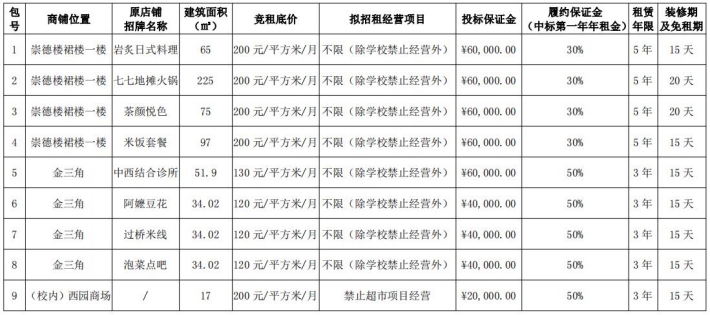 受湖南中南林科大资产经营有限公司(以下简称“资产经营公司”)委托,湖南开言项目管理有限公司对中南林业科技大学商铺进行公开竞价招租,现将竞价招租事项公告如下: