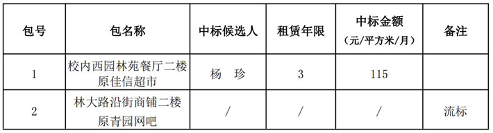 中南林业科技大学经营性门面公开竞租项目于2021年12月23日结束,现将中标(成交)结果公告如下: